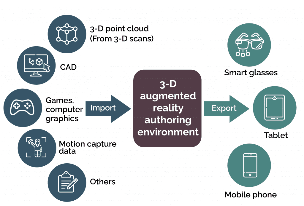 Enterprise AR content is strategized based on imported, utilized, and exported using the general AR Architecture (shown below).