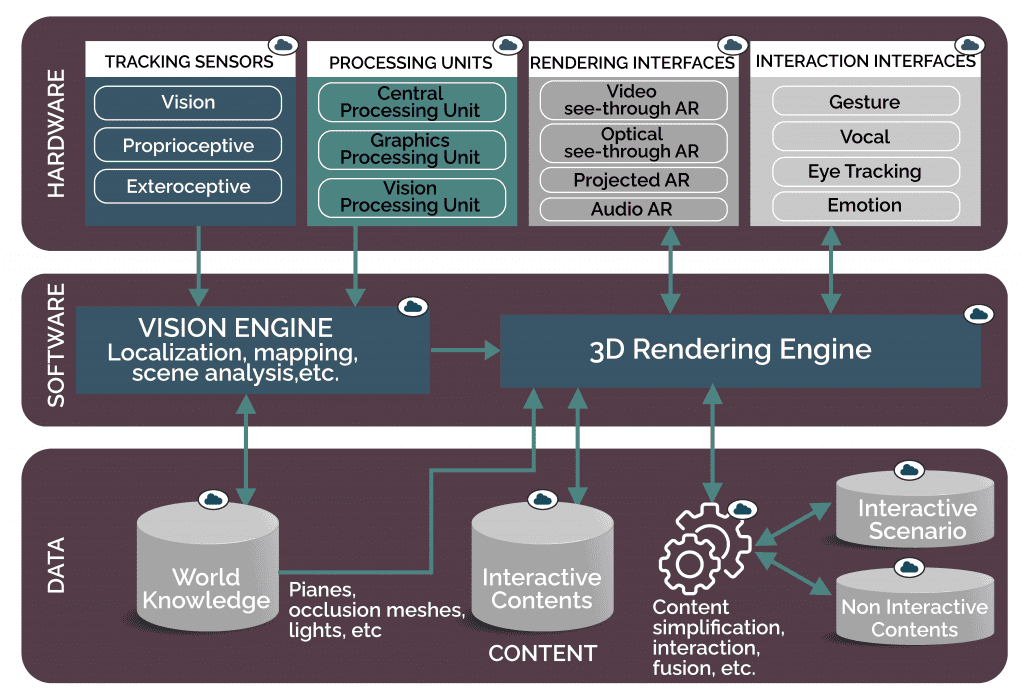 During the connecting stage, delivering AR experiences is performed by systems controlled by software across internal and external enterprise networks. The functions of the software in AR include: