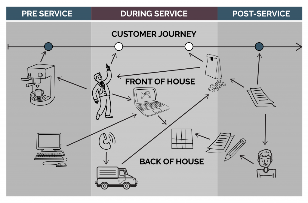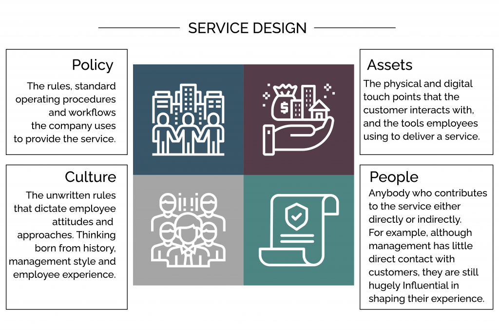 • Assets. These represent digital or physical customer touchpoints in a design. At the same time, these include the tools used by employees to deliver the service.