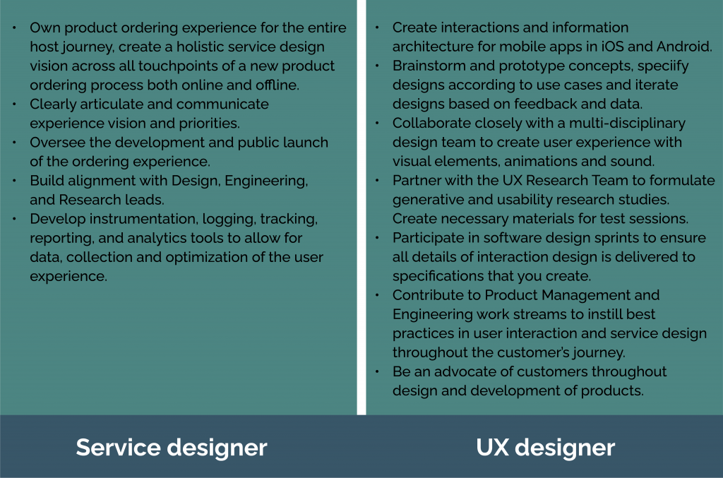 • Service designers need to merge strategic, operations, and people management, while UX designers need to manage only the UX design and their outcomes.