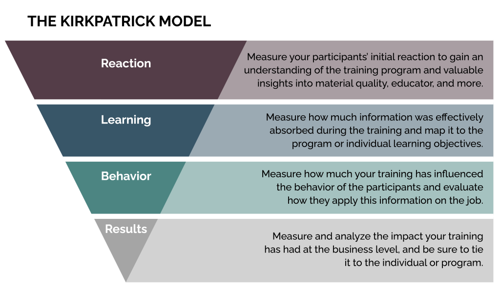 Learning and development professionals have embraced the Kirkpatrick model and continue to adopt it as the standard approach for evaluating training programs. The evaluation model dates back to 1959 when published in the Journal of the American Society of Training Directors that outlines techniques for evaluating training according to four levels of evaluation. The model’s primary strength is that it is easy to understand and implement as the evaluation only includes four levels: reaction, learning, behavior, and results.