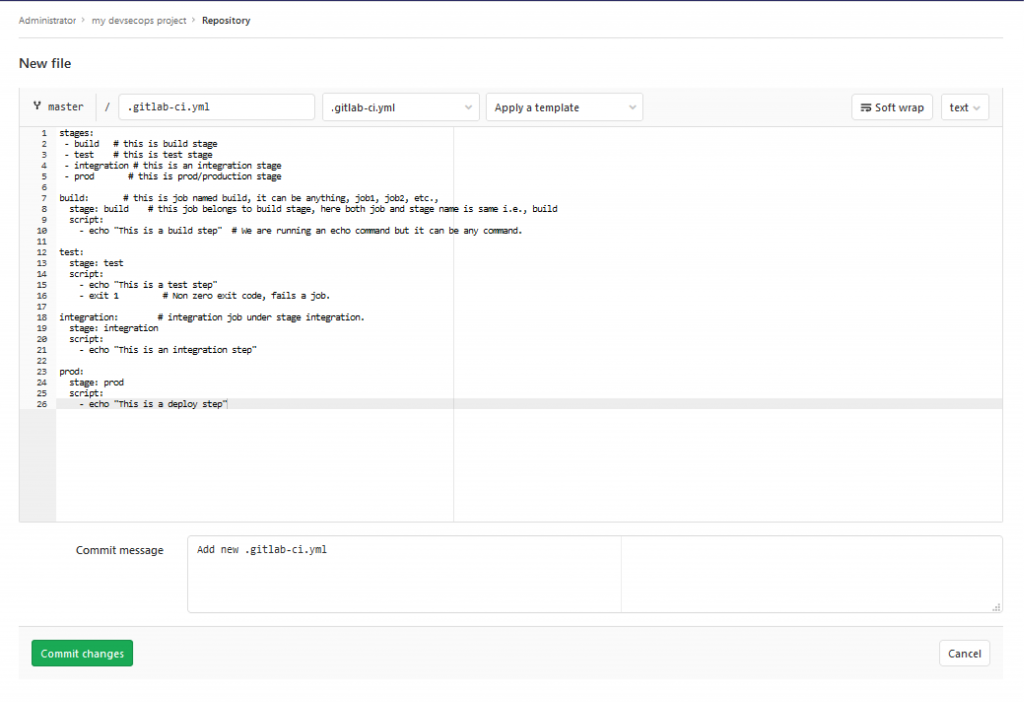 Step 2: Add a new .gitlab-ci.yml file for the CI/CD pipeline stages, tasks, etc. GitLab will auto-detect any changes to this file and run your CI/CD pipeline once any changes or updates occur.