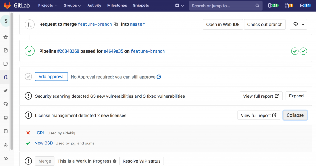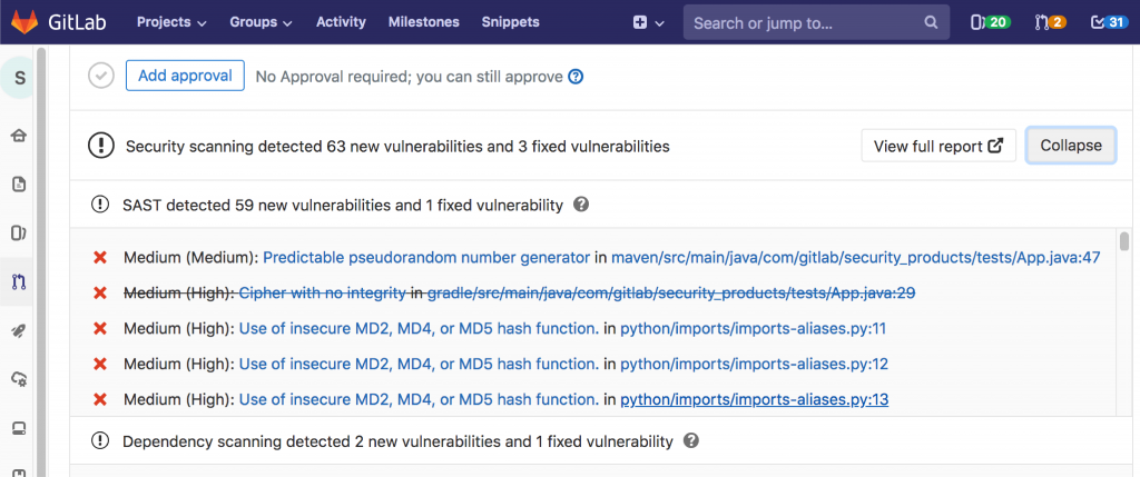 • Each of the following features displays vulnerabilities and analysis results in line with each merge request for immediate resolution.