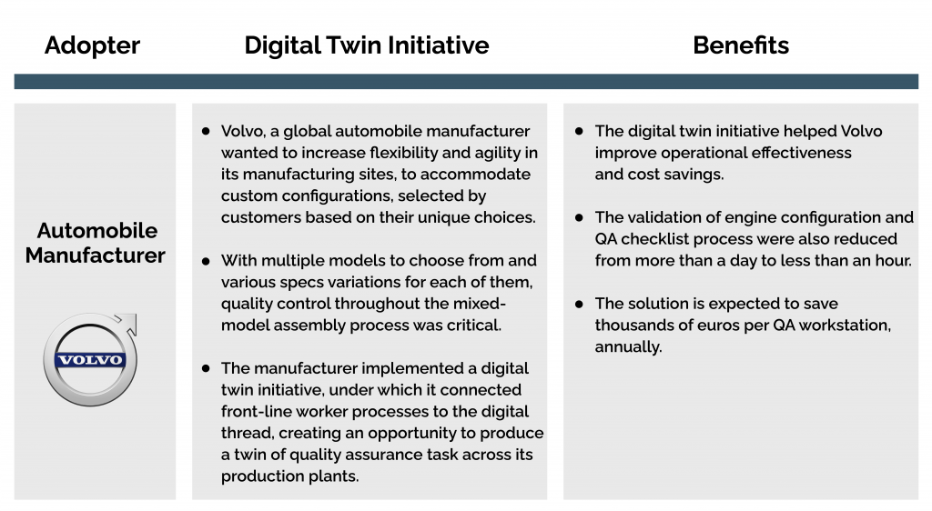 The Volvo Group specializing in manufacturing trucks, construction equipment, and industrial engines employed Digital Twin and Digital Thread technologies to update and scale QA for AR experiences continuously. Each engine required 40 checks with about 200 possible QA variants that had to be executed in 8 minutes at the QA station. Usually, it took five weeks to train employees on this complex inspection procedure. So, Volvo combined Digital Twins and Digital Threads to establish and maintain data flow consistency and efficiency. They leveraged the Internet of Things (IoT) for data integration across various platforms to ensure real-time data synchronization.
