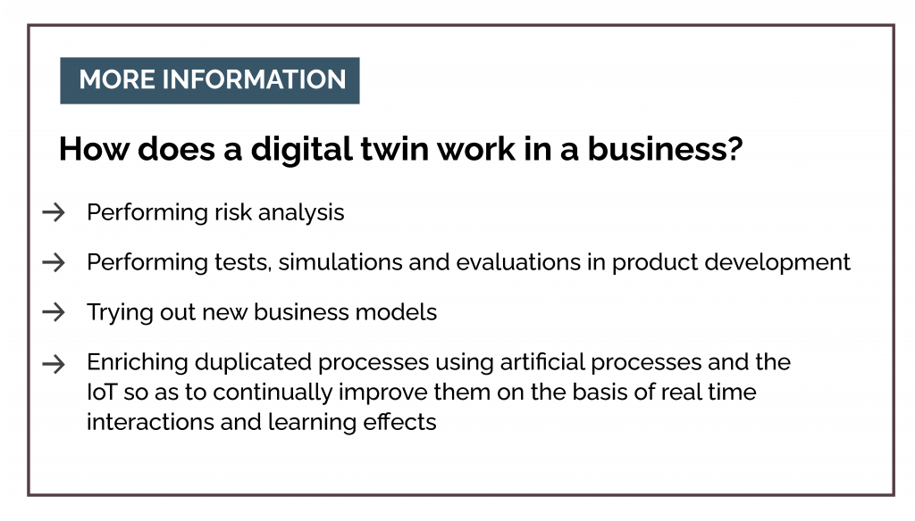 Digital Twins allow engineers to test a physical product through virtual modeling and monitor which aspects may need to be improved, replaced, or augmented. It also helps evaluate the risks and issues that might occur in the future without ever using the product.