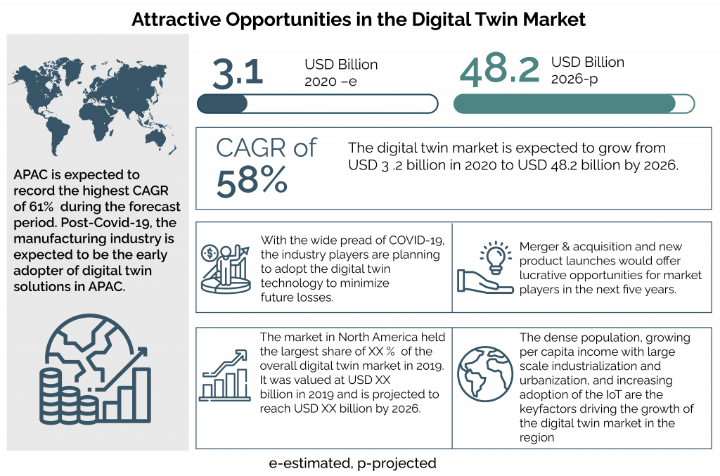 • Experts predict the global Digital Twin market to reach USD 48.2 billion by 2026 with a CAGR of 58%.