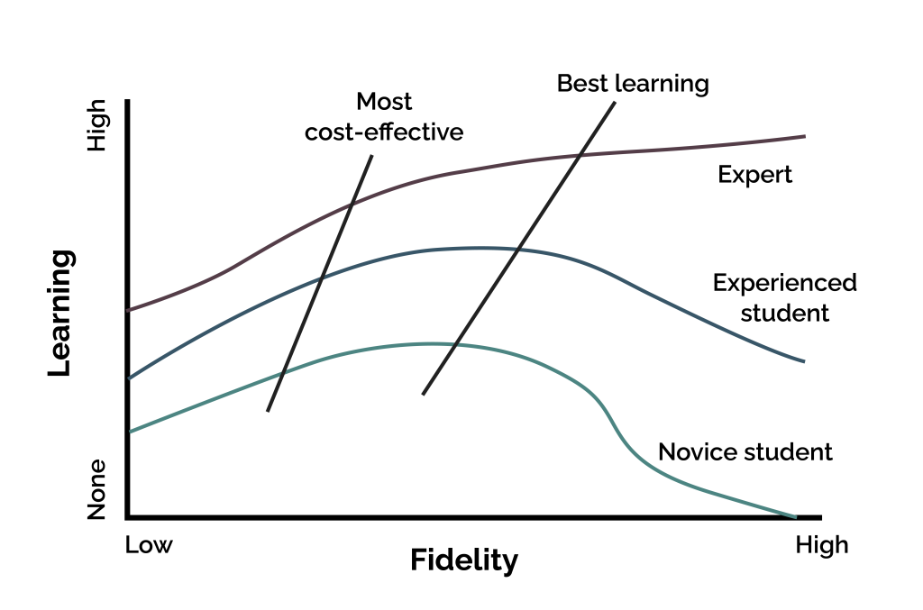 Even though the main body of this article is meant to examine the relationship between fidelity and learning effectiveness, through the review of the literature there were several other participant outcomes demonstrated to have a relationship with high-fidelity simulations. These outcomes include heightened levels of participant self-efficacy, stress, and self-confidence in skill deployment. Increased Self-Efficacy Increased self-efficacy was one of the most commonly discussed factors in relation to high-fidelity simulations. Perceived self-efficacy concerns an individual’s perception of self-confidence to successfully complete a task (Bandura, 1977) and is believed to be influential on the student’s level of performance, choice of tasks, and the amount of effort put into performing those tasks. Self-efficacy which has been acquired before or during training leads to an increased motivation to learn and better learning outcomes (Salas et al., 2012). One article for example utilized a measure of self-efficacy which was given to participants at the beginning, middle, and end of their designated simulation training, and found that those who participated in the high-fidelity simulation showed statistically significant improvement in self-efficacy following each completion of the survey, as compared to the control group who only showed improvement once during the survey completion. Additionally, another study that examined high-fidelity and self-efficacy in law enforcement officers found that high fidelity increased self-efficacy, emotional arousal, and led to positive training transfer from the lessons learned in the simulator scenarios. Increased Stress Another factor observed to be unique to high-fidelity simulations was the increased level of stress experienced by participants as compared to those in low-fidelity simulation. Some of the possible explanations given for this increased stress response included the amplified level of external audio and visual stimuli, as well as the hyper-realistic form factor of the simulated patient who in this specific simulation was bleeding and outwardly experiencing pain. Even though stress from an outside consideration may be considered a negative experience, the authors of this article argued that induced stress during high-fidelity simulation may be beneficial for the participants as they may be able to develop their stress management skills within this simulated environment to be carried over into actual clinical practice. Increased Self-Confidence One article, in particular, attempted to assess the level of confidence participants felt in employing skills learned during the simulation-based training, after having found inflated levels of self-confidence in participants of previously conducted studies using high-fidelity simulation. In this article, participants were randomly assigned to two groups of LF and HF simulation during curricular advanced life support (ALS) training courses. Before the course, 69% of participants in the HF group were assumed to have a significant advantage over the LF group in skill development, which did not significantly decrease over the training, with 53% of the participants still reporting assumed advantage at completion. Additionally, 41% of students in the HF group considered themselves better performers in handling resuscitation despite having no knowledge of the LD group's training process. Even though confidence of skill development would typically be considered a positive outcome, in this case, the authors of this article wanted to specifically highlight the dangers associated with overly elevated levels of confidence after the completion of an HFS as there is a positive link between overconfidence and risk-taking behaviors.