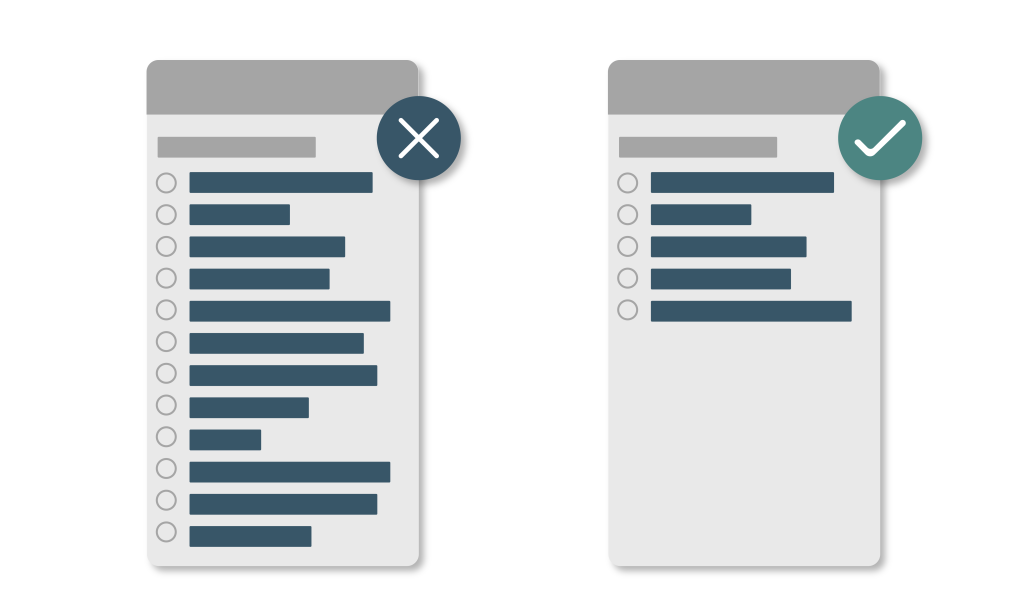 Would you instead scroll through a list of a hundred items or five? If users are looking for a single option, they’ll find having to search through myriad options frustrating. Hicks Law states that the time it takes for people to make decisions depends on the number of options available. The time it takes to make a choice increases with the number and complexity of the possibilities. Here, simple is best.