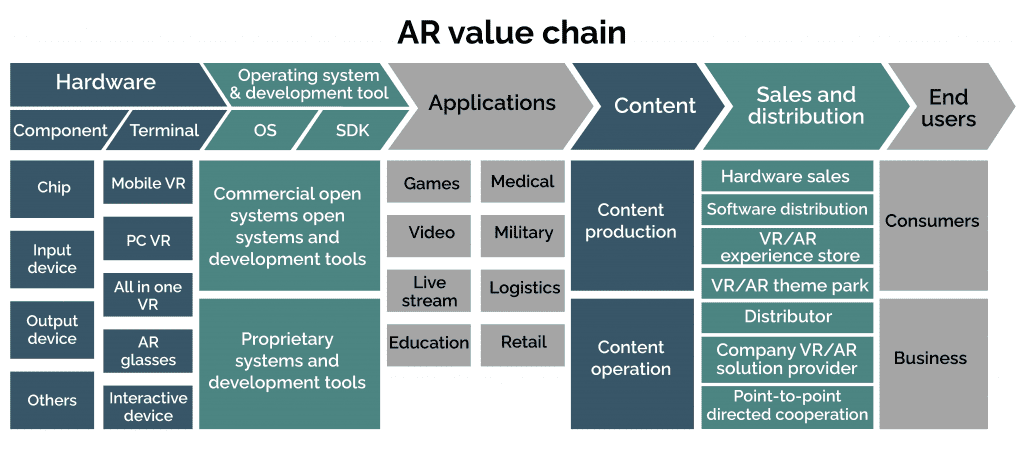 In the connecting stage, the hardware that produces signals detected by the user’s auditory, tactile or visual senses, tactile senses, and light waves are integrated with the core AR enterprise system.