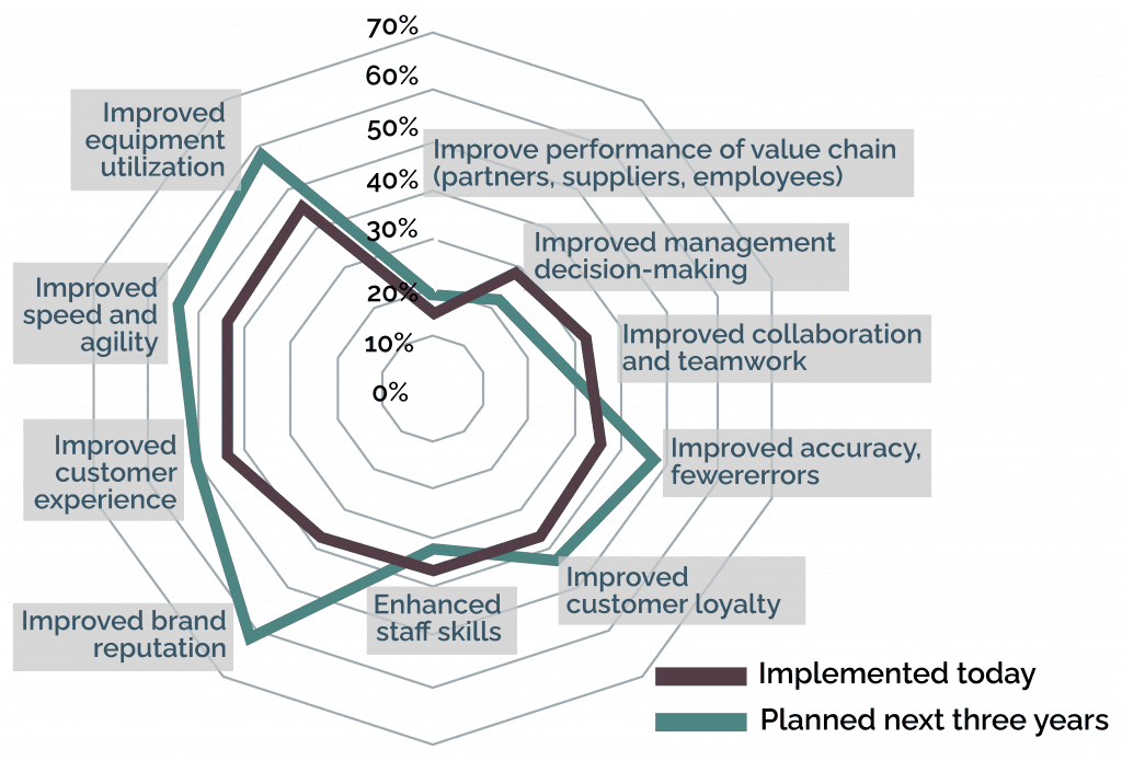 Of 300 respondents, one-third (a total of 106) have already implemented an AR initiative at an enterprise scale, which meant they are at stage three of the AR maturity model. Of that group, 80% (a total of 85) have implemented AR and expect to be ahead, or far ahead, of their competitors in three years. This meant these respondents are in the leading stage.