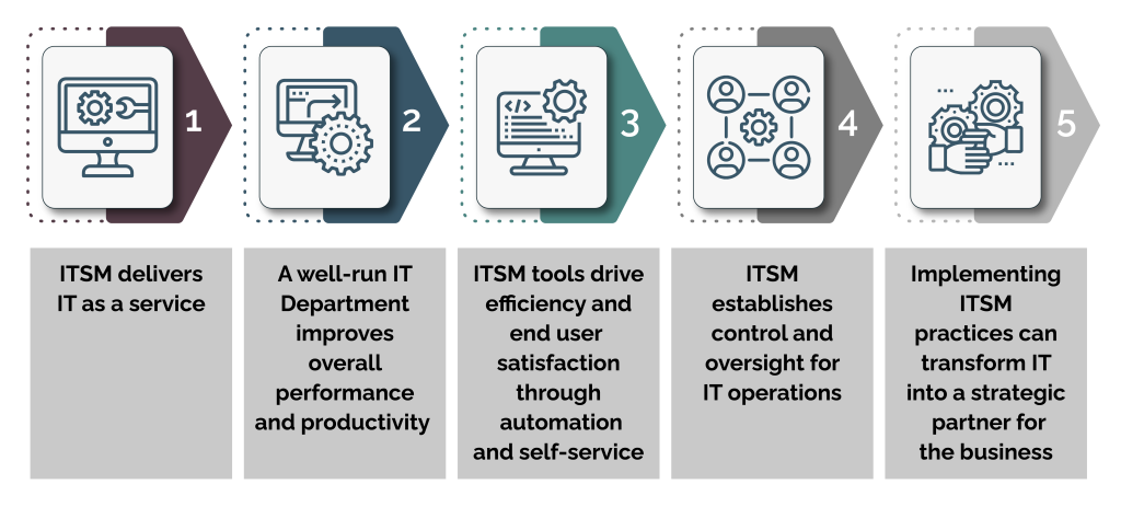 There are some typical approaches to ITSM which have developed over time in the IT industry, positing that an effective ITSM strategy follows three steps: