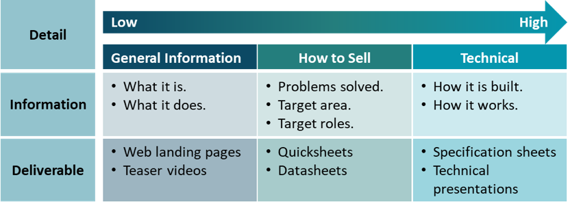 The image below shows different detail levels in marketing documents, a summary of what information can be included in those levels, and some example deliverables.