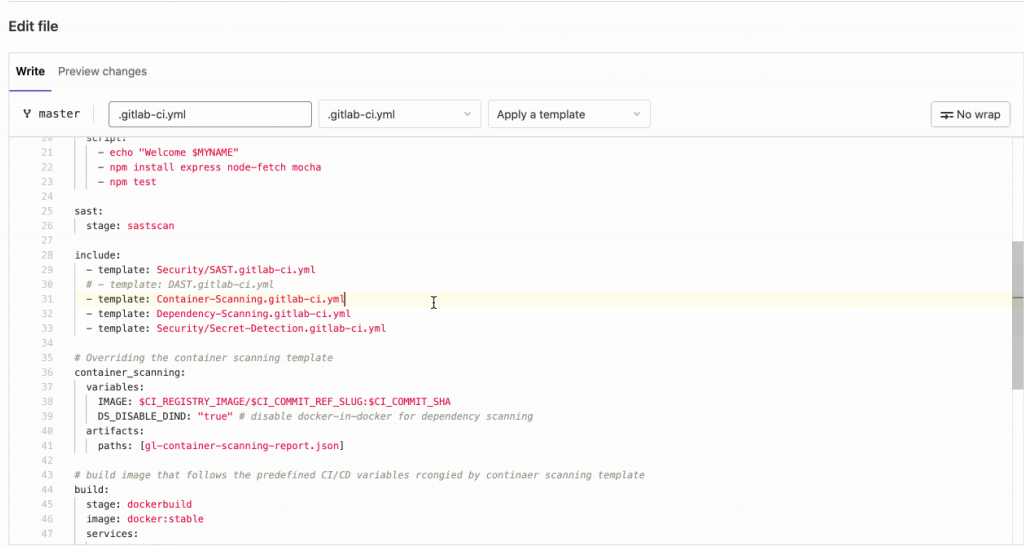 Step 5: Next, manually include the security scan templates in the .gitlab-ci.yml file in your existing project.
