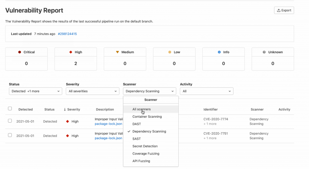 • Each of the following features displays vulnerabilities and analysis results in line with each merge request for immediate resolution.