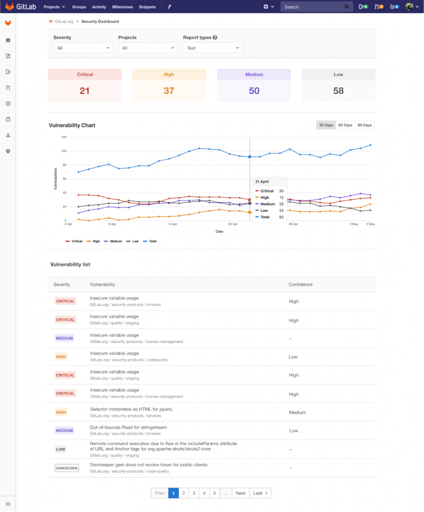 The Security Dashboard is a primary security tool that is available at the group and product levels. It provides an overview of security status and actionable insights to start a remediation process. This tool provides data visualizations for easy consumption of performance information.
