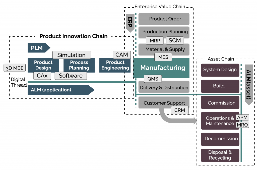 The Digital Thread is a communication framework that enables a connected data flow while offering an integrated view of the asset’s data throughout its lifecycle. It covers all the siloed functional perspectives. The digital thread paradigm delivers the correct information to the right place at the right time.