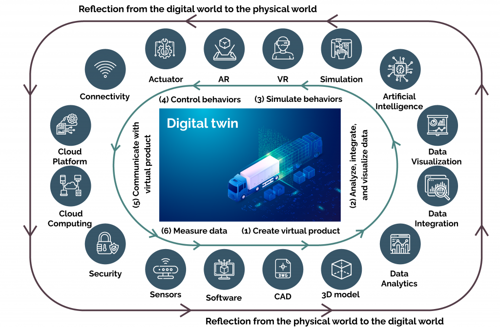 Digital Twin is a technology that engages AR, VR, 3D graphics, cloud, AI, data modeling, and other emerging technologies to build a virtual model of a system, process, product, service, or other physical objects. This virtual replica of the physical world gets updated based on real-time updates and environmental parameters.