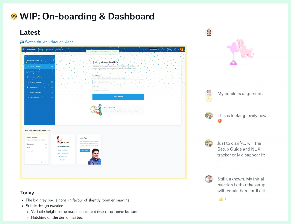 We recommend using a single Paper document created by the designer to track their progress. The entire team can access this document. The designer will have to make an entry for work and share it with the team. They can quickly slide in a few screens and annotate some of the areas for discussion. This can be accompanied by a short walkthrough video as well.