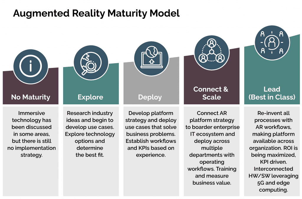 In this light, the AR Maturity Model guides enterprises to use AR for product development, performance improvements, tackling business velocity, managing change, handling opportunities and challenges of connectivity advances, managing resource needs, talent augmentation, and at-scale operations.